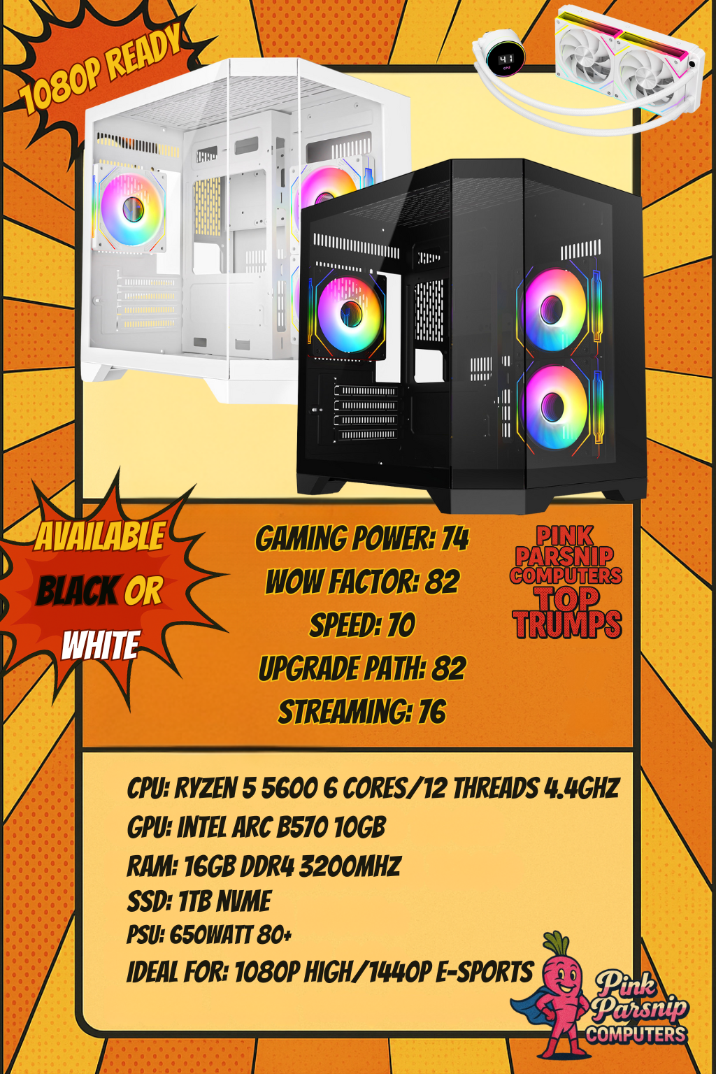 Available in Black or White, with your choice of Blue or White GPU, the Aurora Mid delivers balanced performance and eye-catching style — professionally built and tested by Pink Parsnip Computers.