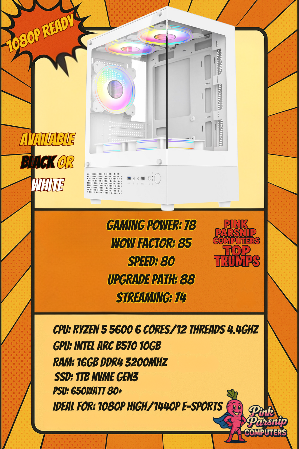 Built around the proven AMD Ryzen 5 5600 and the Intel Arc B570 10GB graphics card, this rig delivers fluid 1080p gameplay in all your favourite titles with stunning ARGB visuals and whisper-quiet cooling.