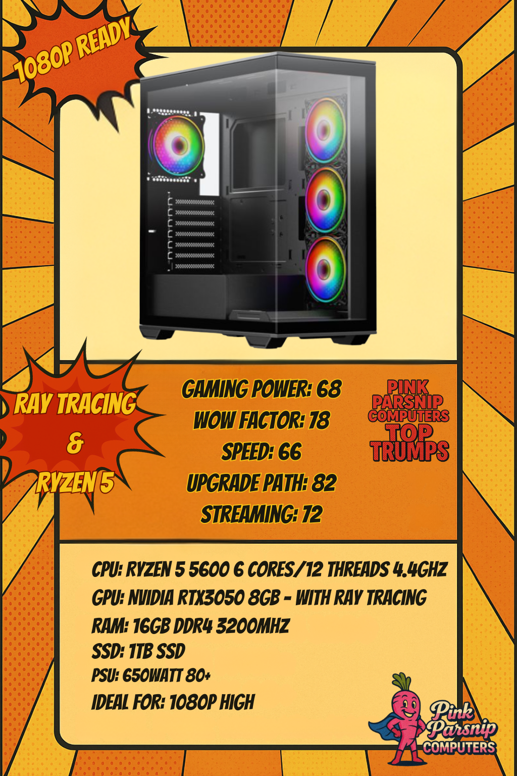 Featuring the reliable Ryzen 5 5600 paired with NVIDIA’s RTX 3050 8GB, this rig delivers smooth 1080p gameplay across all the most popular titles.