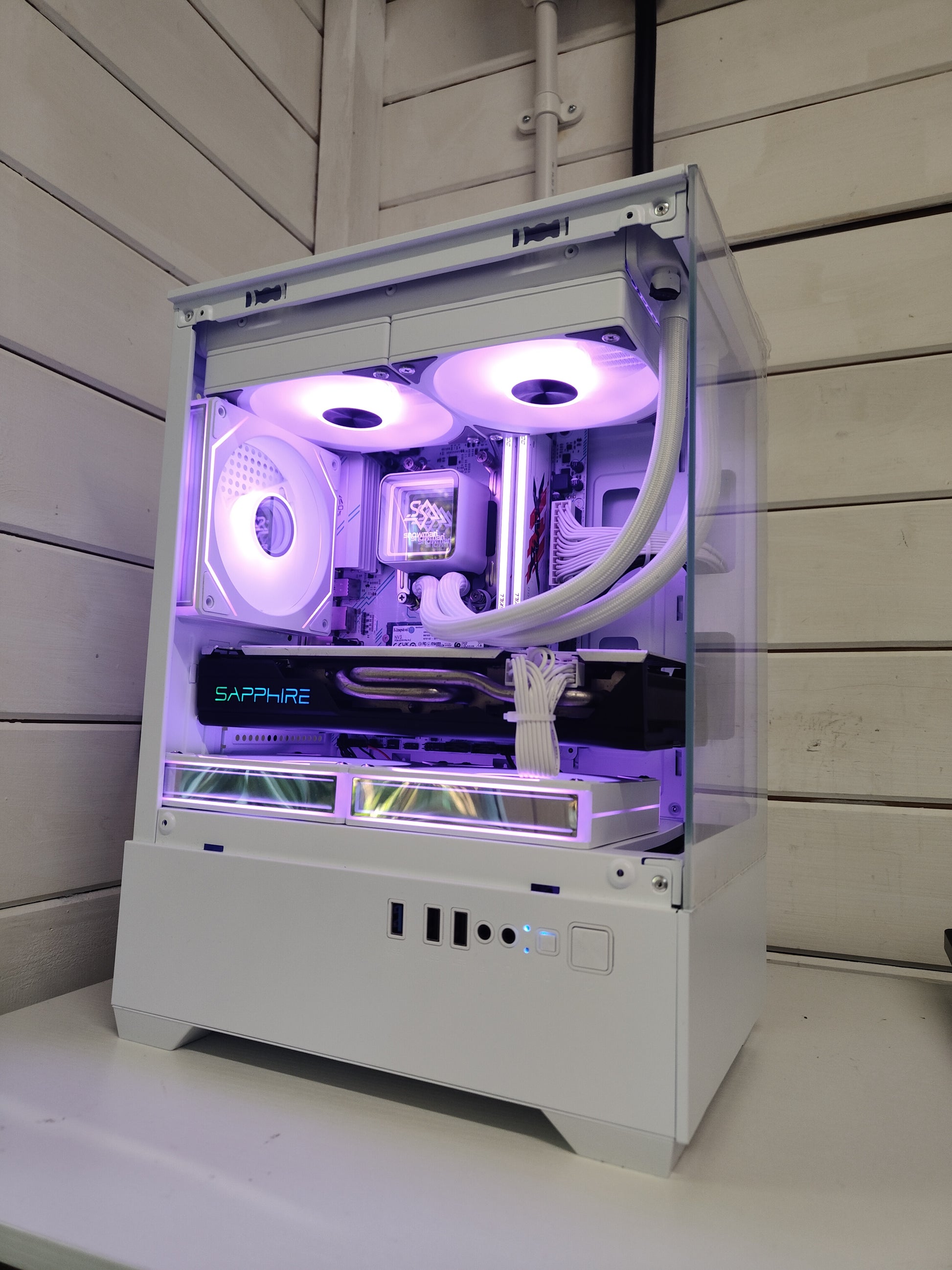 Finished in a sleek tempered glass white case with five ARGB fans (two of them cooling a 240mm AIO), this little PC genuinely looks like it belongs on a Pinterest mood board.